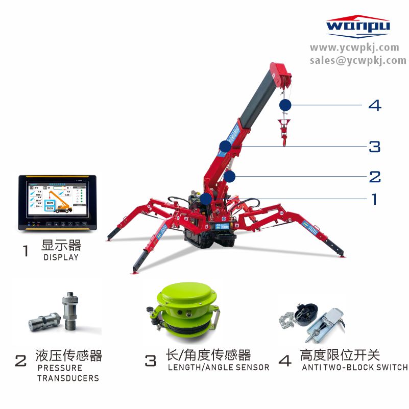 A spider crane is a compact, multifunctional, and mobile small crane. Like all cranes, its safety features are crucial. The spider crane load moment indicator is a safety protection system specifically designed for small cranes. This system monitors real-time data such as the working radius, boom angle, boom length, and actual load during operation. When a hazardous condition arises, it can issue warning signals and stop commands to ensure the crane operates safely.